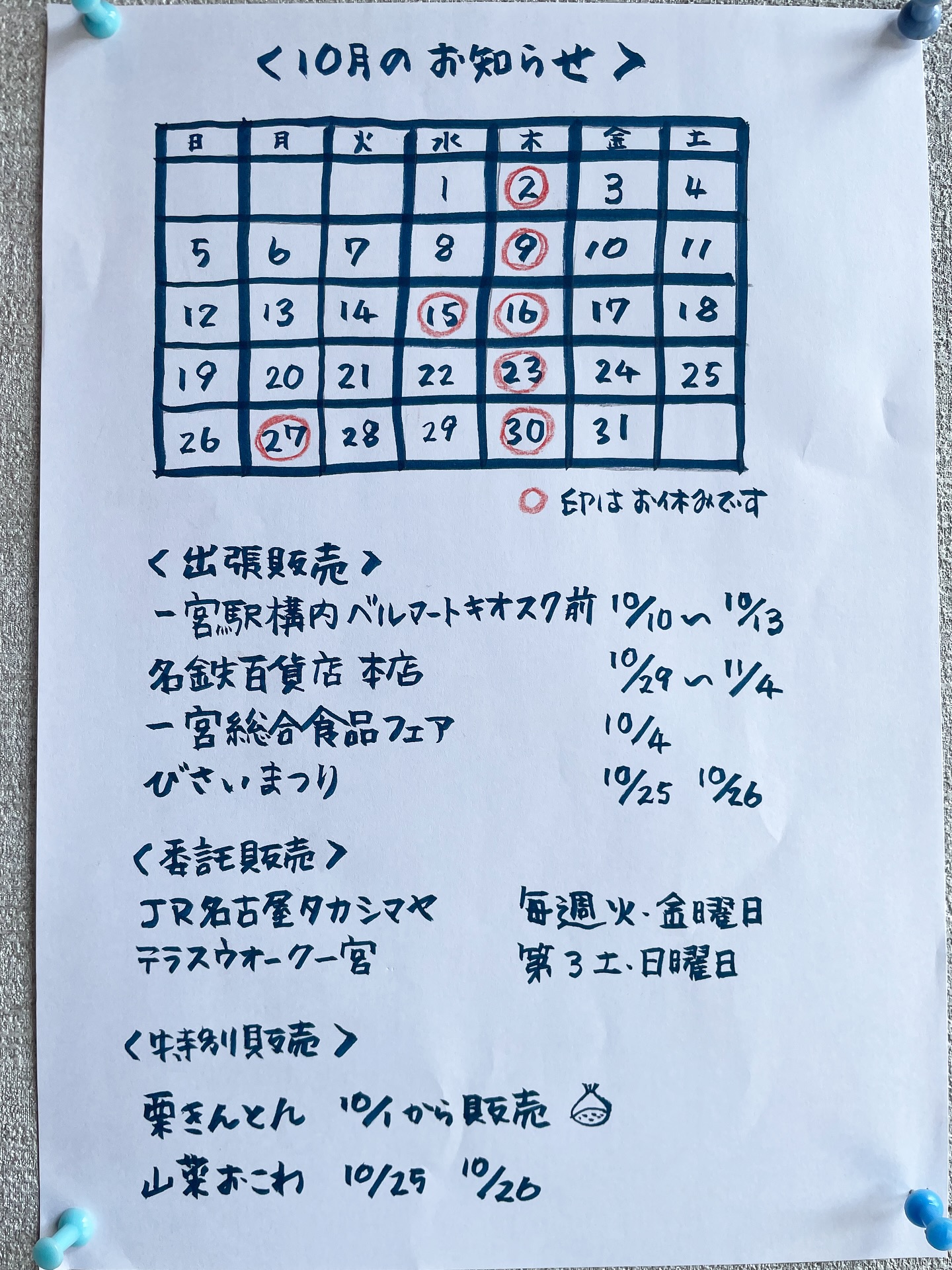 2025年10月の営業について、お知らせいたします。